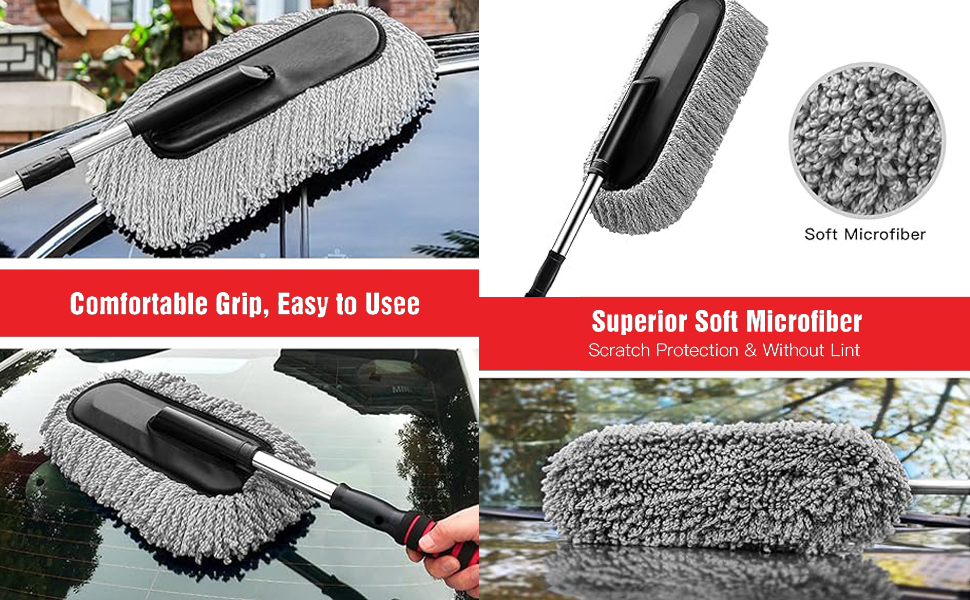 - The telescoping handle allows you to clean the roof or hood of your car without bending or reaching! Not only for the car care including dust and snow removing, but also for the home cleaning.